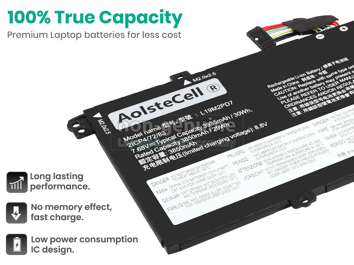 Our Website is your source of high-grade Lenovo laptop batteries! This brand new 30Wh(2 cells) replacement Lenovo L19M2PD7 Li-Polymer battery is made with high-grade cells from Samsung, LG and Panasonic to ensure maximum performance. The housing of the Lenovo L19M2PD7 battery pack is made of non flammable and very durable plastic, which is fire-retarded and nonperishable when dropped from low heights.