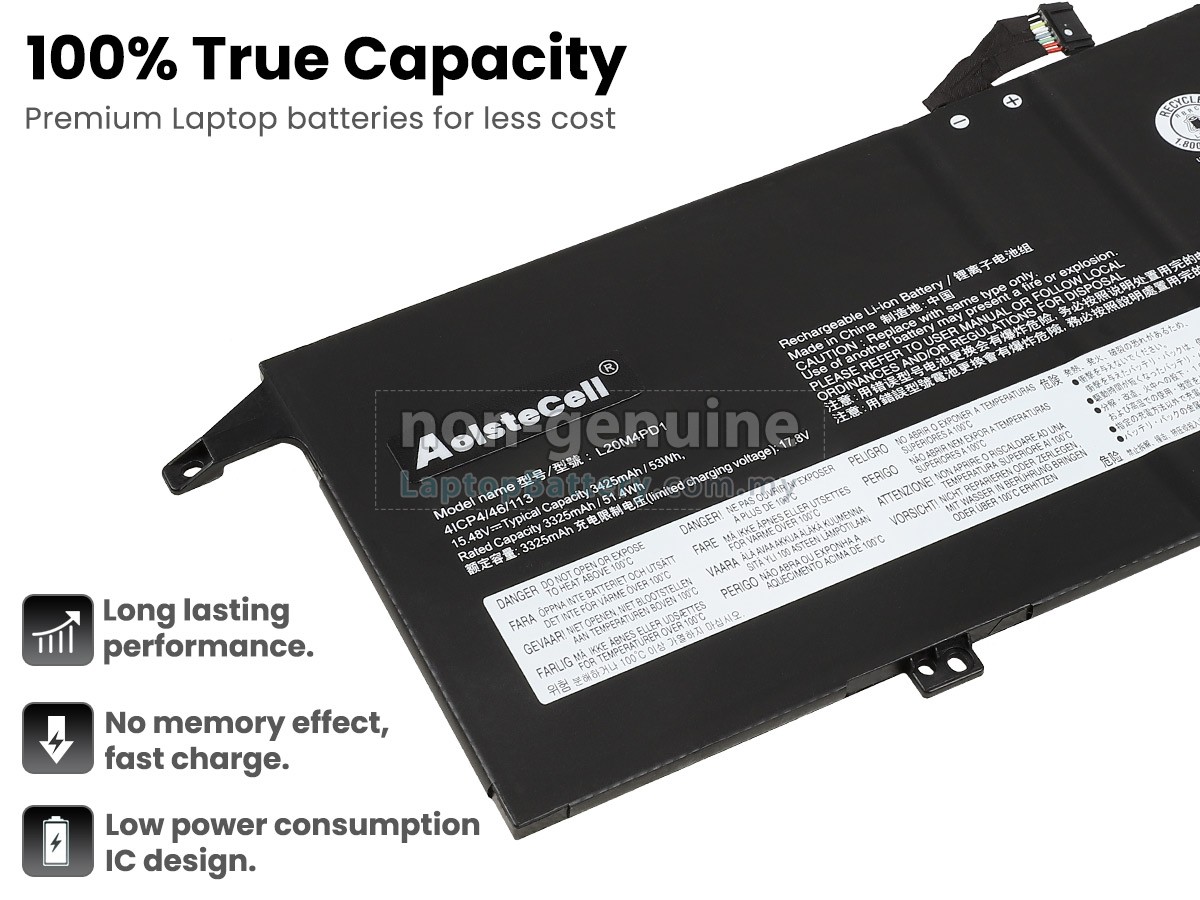 Our Website is your source of high-grade Lenovo laptop batteries! This brand new 53Wh(4 cells) replacement Lenovo L20M4PD1 Li-Polymer battery is made with high-grade cells from Samsung, LG and Panasonic to ensure maximum performance. The housing of the Lenovo L20M4PD1 battery pack is made of non flammable and very durable plastic, which is fire-retarded and nonperishable when dropped from low heights.