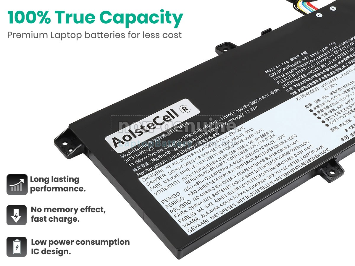 Our Website is your source of high-grade Lenovo laptop batteries! This brand new 46.5Wh(3 cells) replacement Lenovo L21C3PD5 Li-Polymer battery is made with high-grade cells from Samsung, LG and Panasonic to ensure maximum performance. The housing of the Lenovo L21C3PD5 battery pack is made of non flammable and very durable plastic, which is fire-retarded and nonperishable when dropped from low heights.