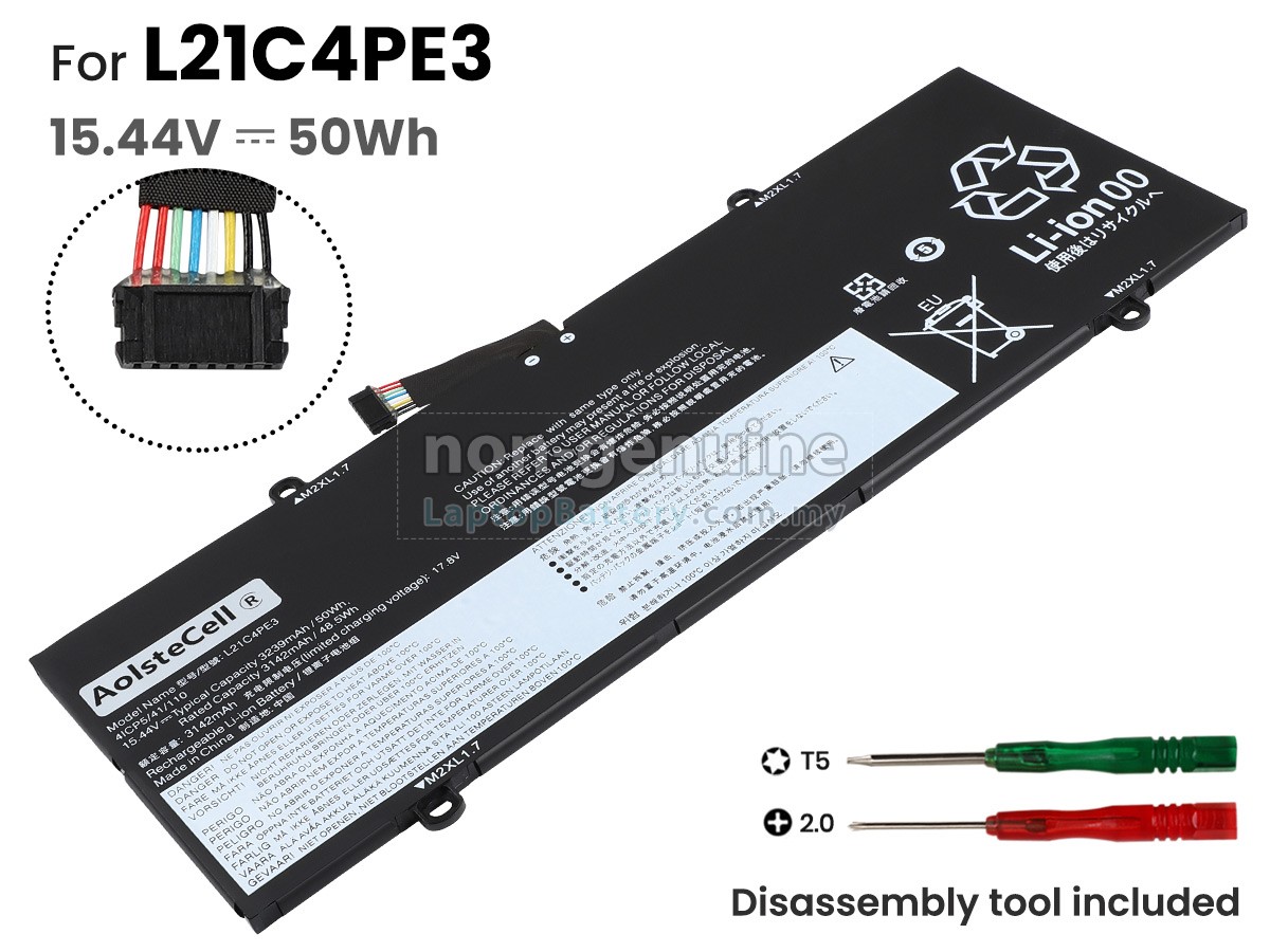Our Website is your source of high-grade Lenovo laptop batteries! This brand new 50Wh(4 cells) replacement Lenovo L21D4PE3 Li-Polymer battery is made with high-grade cells from Samsung, LG and Panasonic to ensure maximum performance. The housing of the Lenovo L21D4PE3 battery pack is made of non flammable and very durable plastic, which is fire-retarded and nonperishable when dropped from low heights.