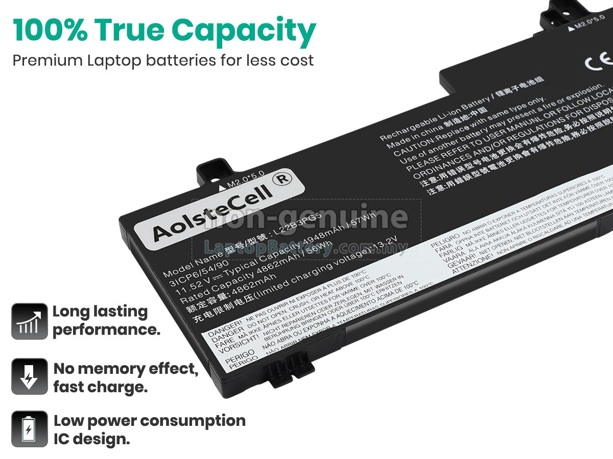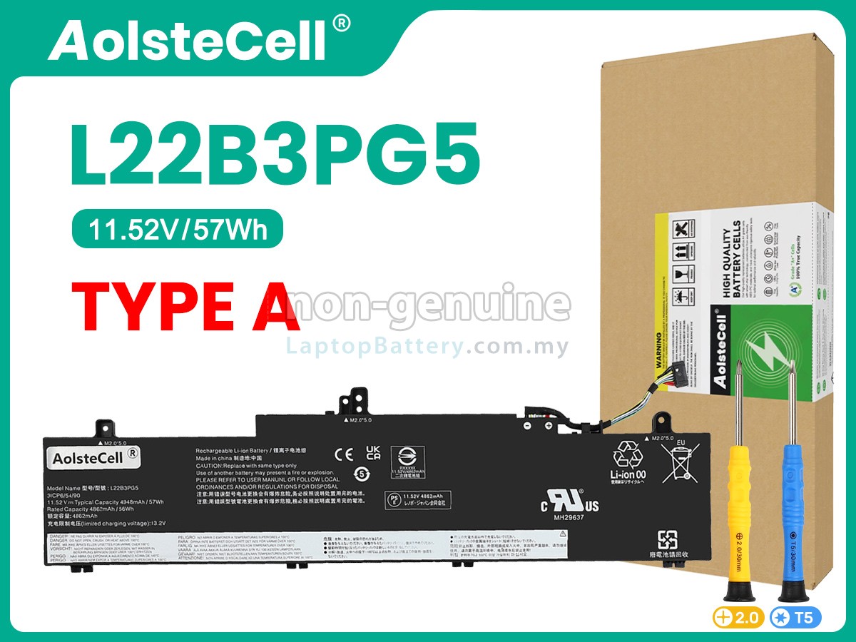 Our Website is your source of high-grade Lenovo laptop batteries! This brand new 57Wh(3 cells) replacement Lenovo L22D3PG5 Li-Polymer battery is made with high-grade cells from Samsung, LG and Panasonic to ensure maximum performance. The housing of the Lenovo L22D3PG5 battery pack is made of non flammable and very durable plastic, which is fire-retarded and nonperishable when dropped from low heights.