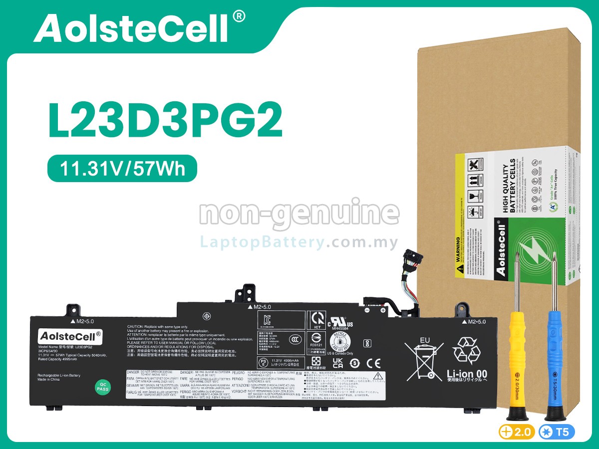 Our Website is your source of high-grade Lenovo laptop batteries! This brand new 57Wh(3 cells) replacement Lenovo L23C3PG2 Li-ion battery is made with high-grade cells from Samsung, LG and Panasonic to ensure maximum performance. The housing of the Lenovo L23C3PG2 battery pack is made of non flammable and very durable plastic, which is fire-retarded and nonperishable when dropped from low heights.