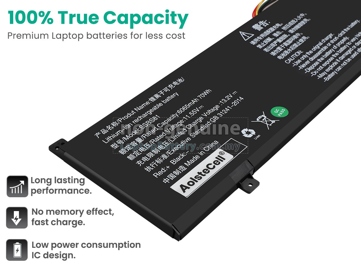 Our Website is your source of high-grade Mechrevo laptop batteries! This brand new 70Wh(3 cells) replacement Mechrevo 16HD-5BB6U Li-Polymer battery is made with high-grade cells from Samsung, LG and Panasonic to ensure maximum performance. The housing of the Mechrevo 16HD-5BB6U battery pack is made of non flammable and very durable plastic, which is fire-retarded and nonperishable when dropped from low heights.