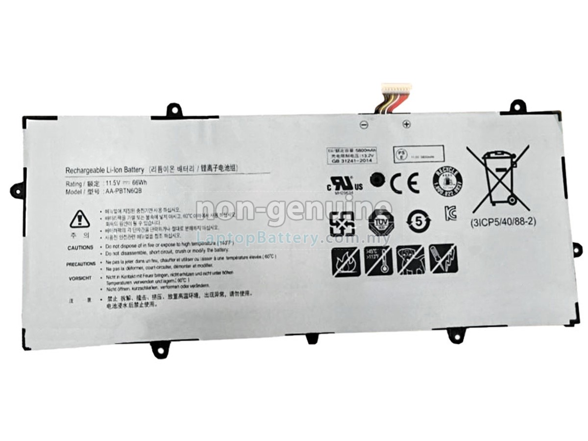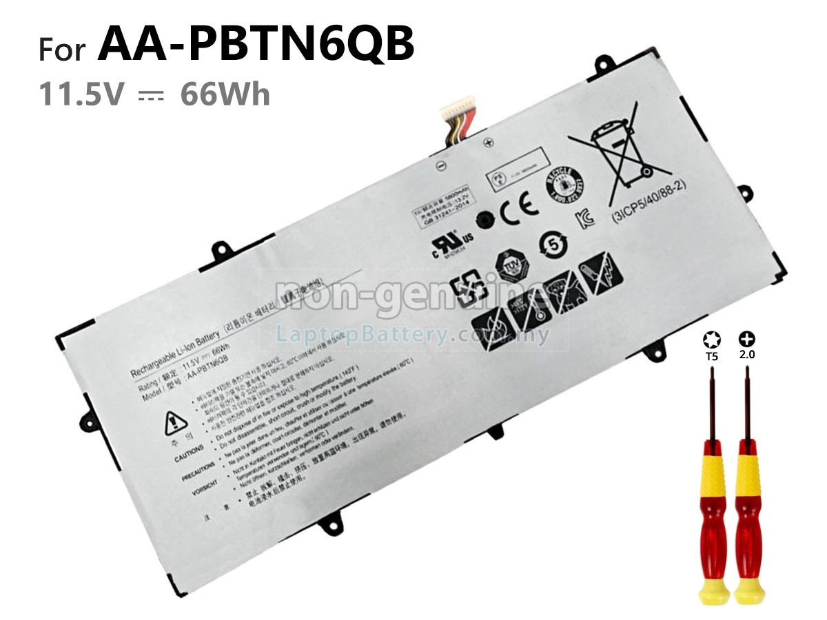 Our Website is your source of high-grade Samsung laptop batteries! This brand new 66Wh(6 cells) replacement Samsung AA-PBTN6QB Li-Polymer battery is made with high-grade cells from Samsung, LG and Panasonic to ensure maximum performance. The housing of the Samsung AA-PBTN6QB battery pack is made of non flammable and very durable plastic, which is fire-retarded and nonperishable when dropped from low heights.