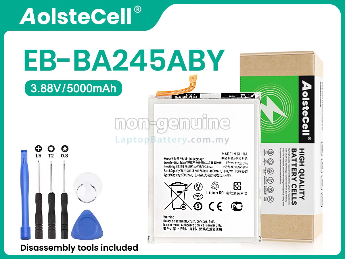 Our Website is your source of high-grade Samsung batteries! This brand new 5000mAh(1 cells) replacement Samsung EB-BA245ABY Li-ion battery is made with high-grade cells from Samsung, LG and Panasonic to ensure maximum performance. The housing of the Samsung EB-BA245ABY battery pack is made of non flammable and very durable plastic, which is fire-retarded and nonperishable when dropped from low heights.