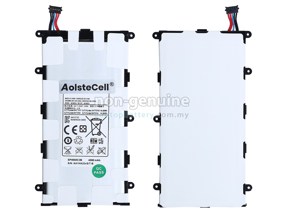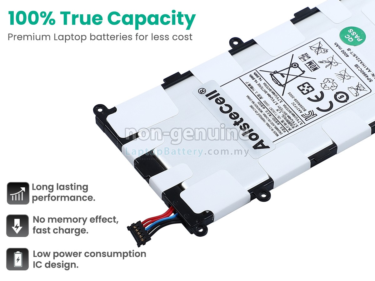 Our Website is your source of high-grade Samsung laptop batteries! This brand new 4000mAh(2 cells) replacement Samsung Galaxy TAB P6200 Li-Polymer battery is made with high-grade cells from Samsung, LG and Panasonic to ensure maximum performance. The housing of the Samsung Galaxy TAB P6200 battery pack is made of non flammable and very durable plastic, which is fire-retarded and nonperishable when dropped from low heights.