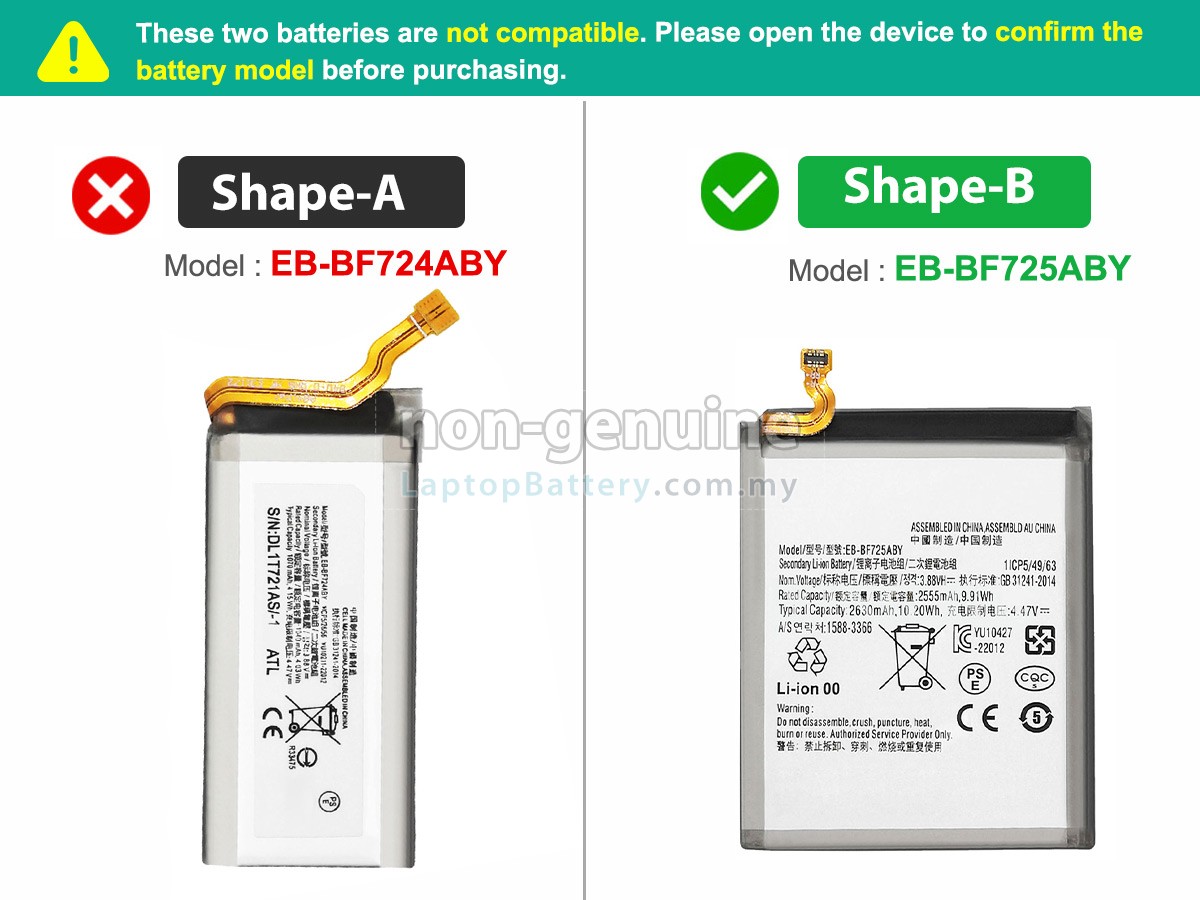 A:First, find out the part number of your old battery or the model name (e.g. 'Samsung GALAXY Z FLIP4 SM-F721U1') and then match with our product compatibility table. Second, please compare your old battery with our product images to make sure their shapes are the same. Finally, check the voltage (rating) is the same as the old one.