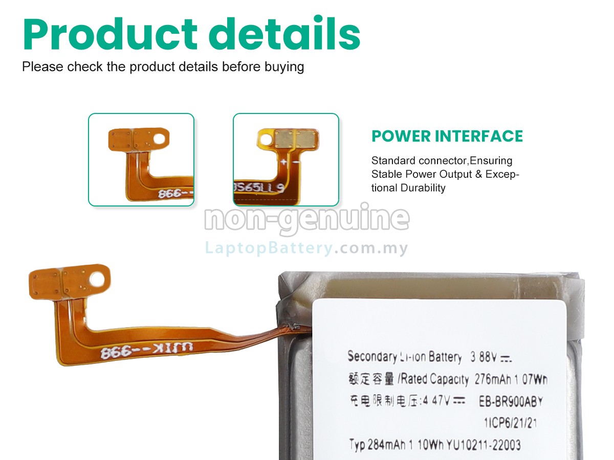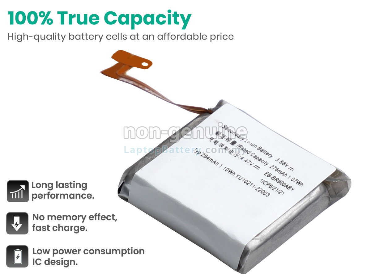 Our Website is your source of high-grade Samsung watch batteries! This brand new 1.07Wh(1 cells) replacement Samsung R905 Li-Polymer battery is made with high-grade cells from Samsung, LG and Panasonic to ensure maximum performance. The housing of the Samsung R905 battery pack is made of non flammable and very durable plastic, which is fire-retarded and nonperishable when dropped from low heights.