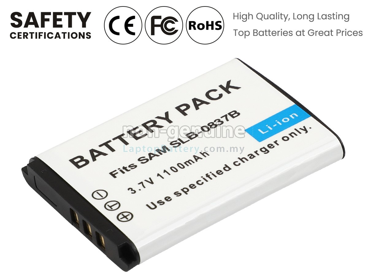 All our high-grade replacement batteries for Samsung SLB-0837B have been tested to prove that they can match or surpass original Samsung battery performance and fit with Original Manufacturer's Specifications. In compliance with international standards, they obtain a series of rigorous safety certifications such as CE, UL, ROHS, ISO9001/9002. In general, this replacement Samsung SLB-0837B battery can be charged/discharged up to more than 600 cycles.