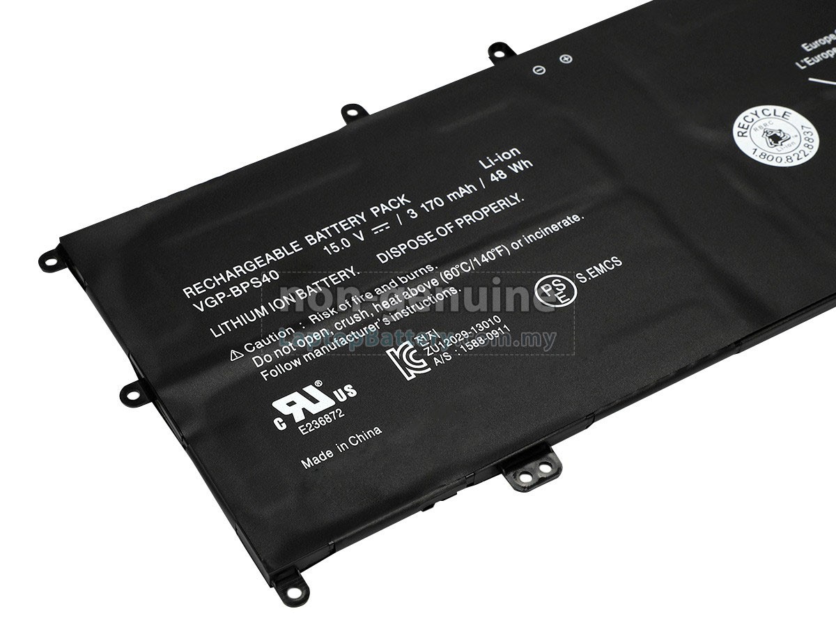 Our Website is your source of high-grade Sony laptop batteries! This brand new 3170mAh(4 cells) replacement Sony SVF14N1S8C Li-Polymer battery is made with high-grade cells from Samsung, LG and Panasonic to ensure maximum performance. The housing of the Sony SVF14N1S8C battery pack is made of non flammable and very durable plastic, which is fire-retarded and nonperishable when dropped from low heights.